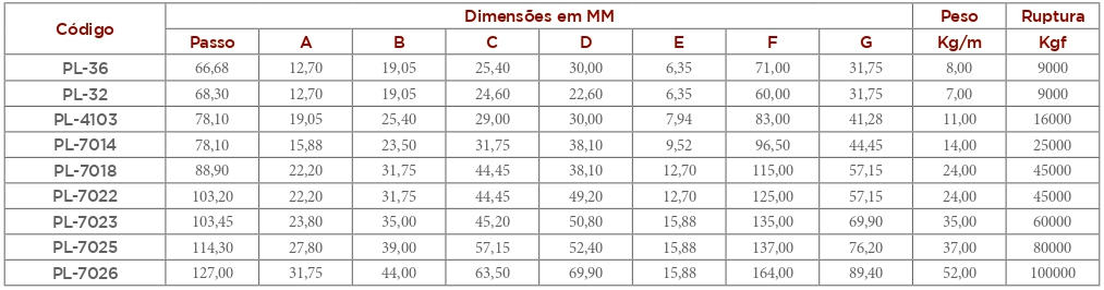 Corrente para Esteira Metálica Corrente para Transportador de Bagaço Corrente para Transportador Intermediário Corrente para mesa alimentadora Corrente para Mesa Alimentadora II Corrente para Mesa Alimentadora III Corrente para Mesa Alimentadora IV Corrente para Cush Cush Corrente para Difusor Corrente para Elevador de Canecas Corrente para Redler Corrente para Redler II Corrente para Redler III Corrente para Mesa de Toras Corrente para Transportador de Cavaco e Toras Corrente para Transmissão